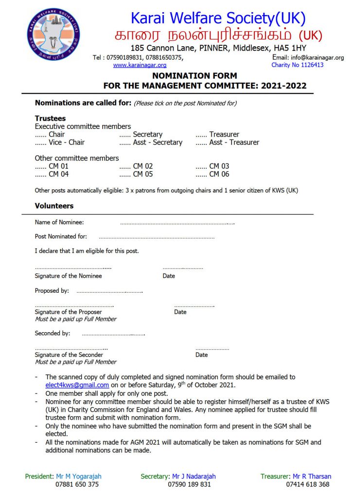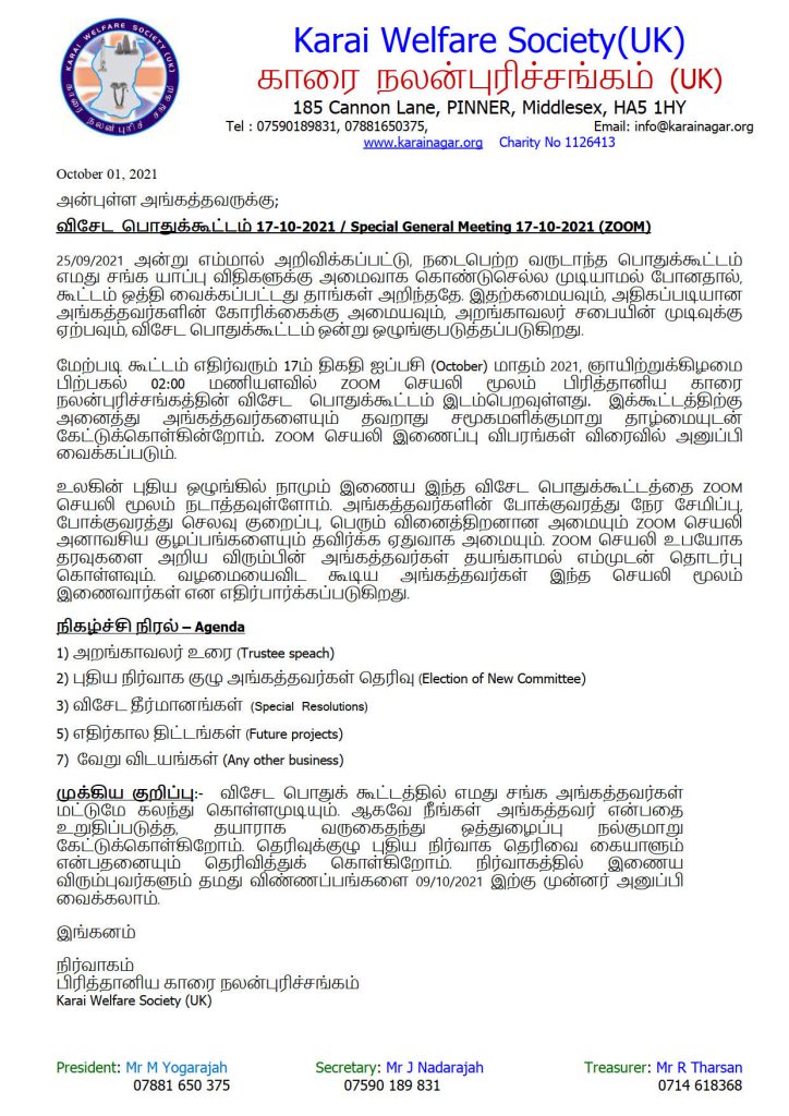 • விசேட பொதுக்கூட்டம் 17-10-2021 / Special General Meeting 17-10-2021 (ZOOM)