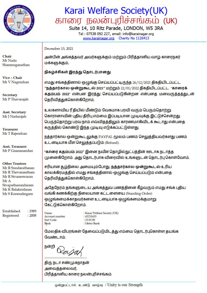நிகழ்ச்சிகள் இரத்து December 15, 2021 Post navigation Previous Previous post: காரை கதம்பம் 2022Next Next post: e-கல்வி விரலி வழங்கல் : 01 Related News வருடாந்த பொதுக்கூட்டம் 2025/2026 September 28, 2025 காரை கதம்பம் 2025 : நிகழ்வறிக்கை February 22, 2025