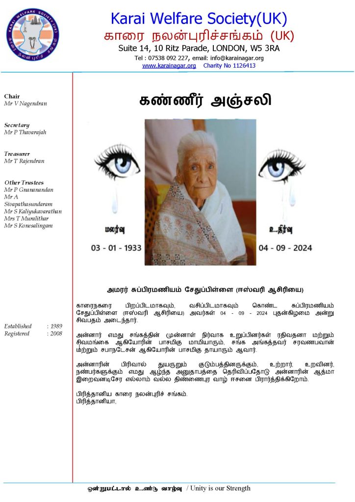 கண்ணீர் அஞ்சலி : அமரர் சுப்பிரமணியம் சேதுப்பிள்ளை September 4, 2024 Post navigation Previous Previous post: கண்ணீர் அஞ்சலி : அமரர் பத்மநாதன் ஐங்கரன்Next Next post: கண்ணீர் அஞ்சலி : அமரர் பஞ்சாட்சரம் பரமேஸ்வரி அம்பாள் Related News புதிய நிர்வாகம் 2025/2026 October 30, 2025 வருடாந்த பொதுக்கூட்டம் 2025/2026 September 28, 2025