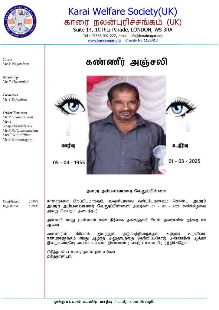 கண்ணீர் அஞ்சலி March 2, 2025 Post navigation Previous Previous post: காரை கதம்பம் 2025 : நிகழ்வறிக்கைNext Next post: காரைநகர் பட்டறை 2025 நிகழ்வு நிழலாக Related News கண்ணீர் அஞ்சலி : அமரர் சுந்தரசிவம் சாவித்திரி November 28, 2024 கண்ணீர் அஞ்சலி : கந்தையா ராசரட்ணம் November 15, 2024
