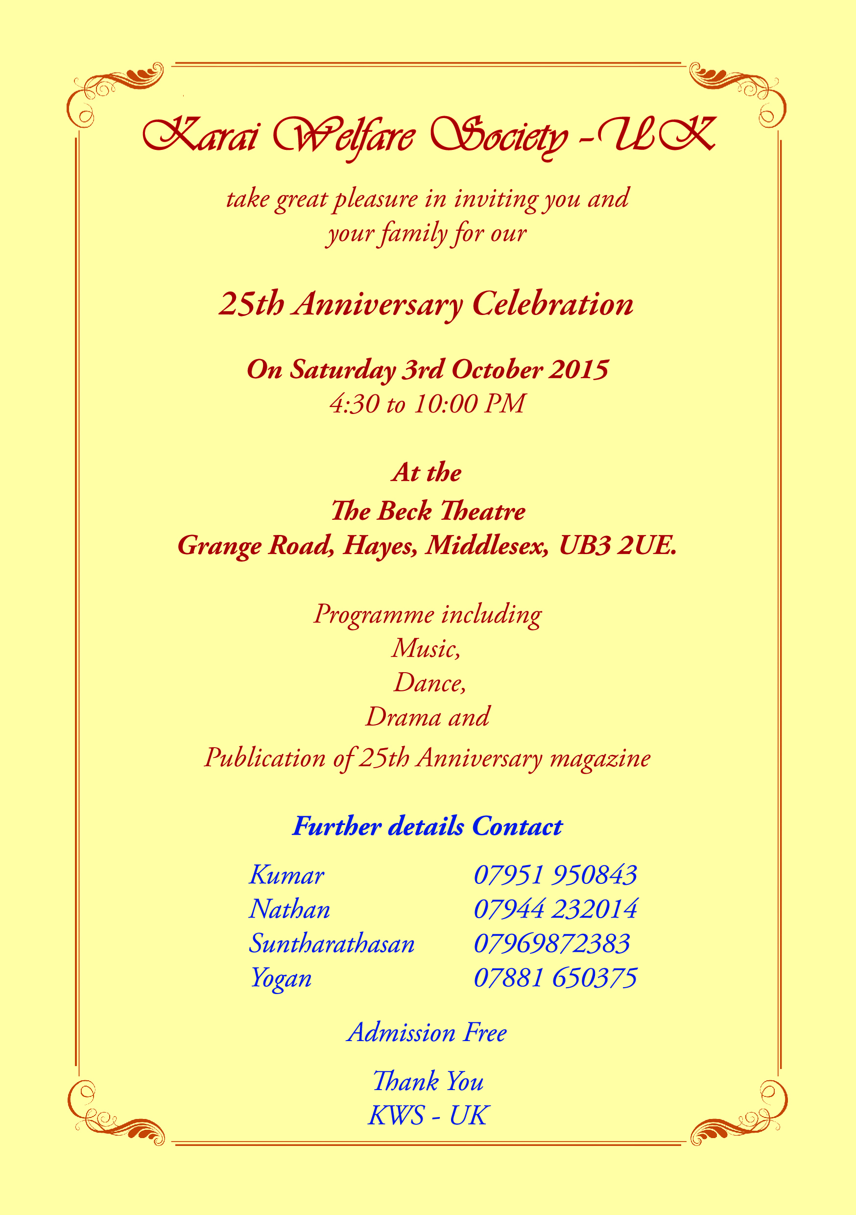 25th ANNIVERSARY EVENT – KARAI WELFARE SOCIETY (UK) September 18, 2015 Please find below the invitation to the Karai Welfare Society’s 25th Anniversary….. Please find below the invitation to the Karai Welfare Society’s 25th Anniversary Post navigation Previous Previous post: Kilinochchi cataract operations ProgrammeNext Next post: வருடாந்த பொதுக்கூட்டம் 18-10-15 / Annual General Meeting 18-10-15 Related News காரை கதம்பம் 2025 : நிகழ்வறிக்கை February 22, 2025 0 காரை கதம்பம் 2025 October 11, 2024 0