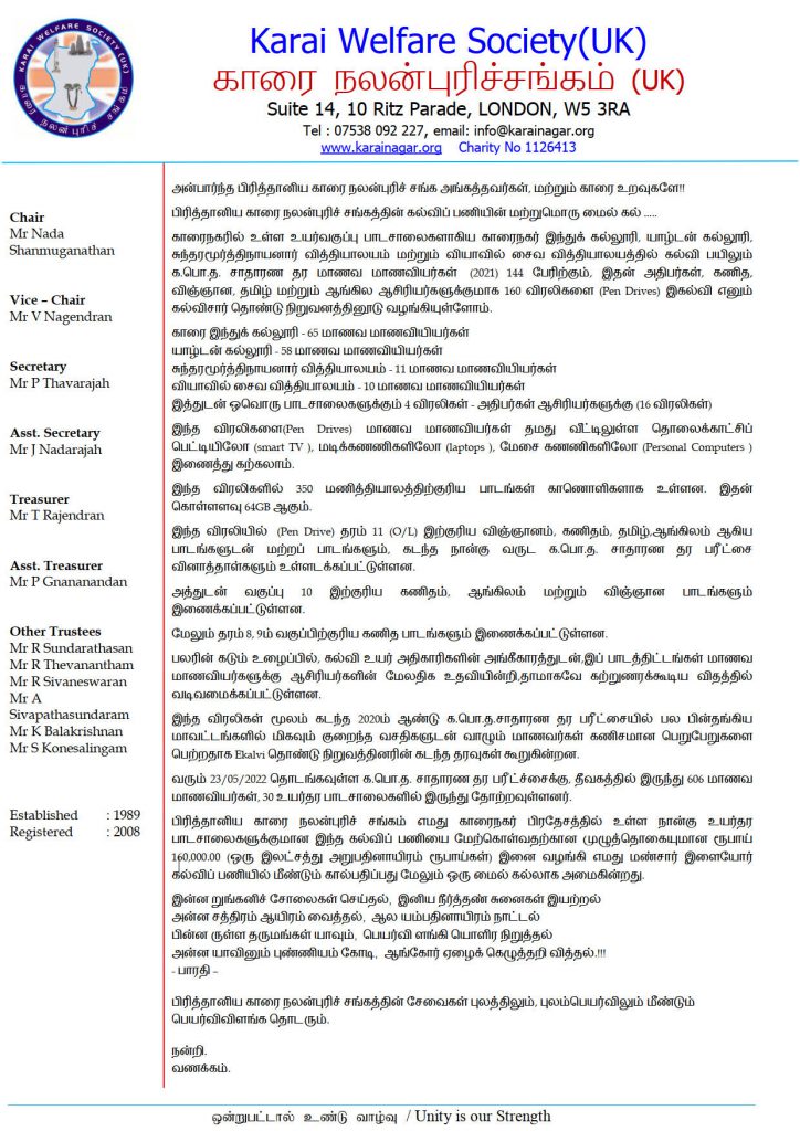 காரைநகருக்கு e-கல்வி November 25, 2021 Post navigation Previous Previous post: புதிய வங்கிக் கணக்கு விபரம்…Next Next post: காரை கதம்பம் 2022 Related News காரைநகர் பட்டறை 2025 நிகழ்வு நிழலாக March 14, 2025 காரை கதம்பம் 2025 : நிகழ்வறிக்கை February 22, 2025