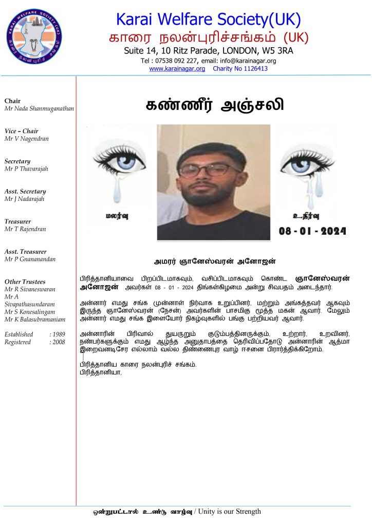 கண்ணீர் அஞ்சலி January 21, 2024 Post navigation Previous Previous post: காரை கதம்பம் 2024 : பிற்போடப்பட்டுள்ளதுNext Next post: ‘வரலாற்றில் காரைநகர்’ நூல் வெளியீடு Related News கண்ணீர் அஞ்சலி March 2, 2025 கண்ணீர் அஞ்சலி : அமரர் சுந்தரசிவம் சாவித்திரி November 28, 2024