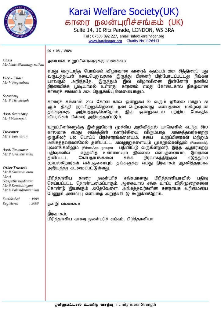 பிரித்தானிய வாழ் காரைநகர் மக்களுக்கான அறிவித்தல் May 9, 2024 Post navigation Previous Previous post: சர்வதேச துடுப்பாட்டத்தில் காரைநகரார்Next Next post: காரை சங்கமம் 2024 Related News புதிய நிர்வாகம் 2025/2026 October 30, 2025 வருடாந்த பொதுக்கூட்டம் 2025/2026 September 28, 2025