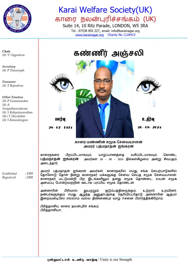 கண்ணீர் அஞ்சலி : அமரர் பத்மநாதன் ஐங்கரன் August 26, 2024 Post navigation Previous Previous post: மக்கள் வெள்ளத்தில் காரை சங்கமம் 2024Next Next post: கண்ணீர் அஞ்சலி : அமரர் சுப்பிரமணியம் சேதுப்பிள்ளை Related News கண்ணீர் அஞ்சலி November 30, 2025 0 கண்ணீர் அஞ்சலி March 2, 2025 0