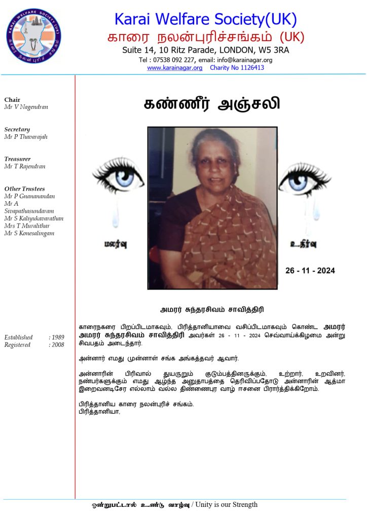 கண்ணீர் அஞ்சலி : அமரர் சுந்தரசிவம் சாவித்திரி November 28, 2024 Post navigation Previous Previous post: இயற்கை சீற்ற அனர்த்த நிதிNext Next post: புத்தாண்டு வாழ்த்துக்கள் Related News கண்ணீர் அஞ்சலி March 2, 2025 கண்ணீர் அஞ்சலி : கந்தையா ராசரட்ணம் November 15, 2024
